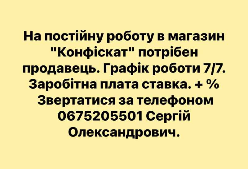 В магазин "Конфіскат" потрібен продавець Всі деталі за номером телефону 067 520 5501 Сергій Олександрович Прикріплені зображення: