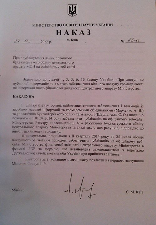 21 февраля 2014 года студенты заняли здание Министерства образование и науки Украины с требованиями перемен. Вместе с политическими требованиями, они выдвинули требования открытой бухгалтерии. Уже 24 марта новый министр подписал указ №85-а о ежедневной публикации всех бухгалтерских проводок за день на сайте министерства. Само по себе открытие данных не должно было занять время, но оказалось, что в МОН фактически не было учетной системы, и, например, главная книга велась на бумаге. Сегодня данные доступны на сайте министерства (UPD: спасибо за новую ссылку sad. Дамп можно скачать по ссылке), кабель на миллион гривен (около 50 тыс. долларов), и почему пока открытая бухгалтерия не так эффективна.