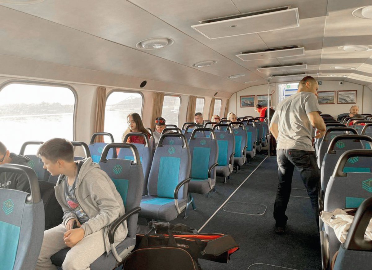 — Діти, заради Бога, сядьте! — дівчата-організатори кричать дітям, які є серед туристів. — Вам не можна виходити з каюти. Небезпечно, бо розженемося до 60 кілометрів на годину.