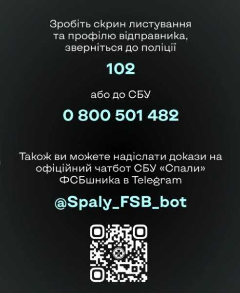 Зробіть скрин листування та профілю відправника, зверніться до поліції — 102 або до СБУ — 0 800 501 482. Також ви можете надіслати докази на офіційний чатбот СБУ «Спали» ФСБшника в Telegram — @Spaly_FSB_bot.